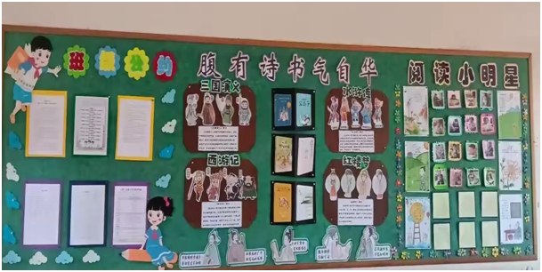 活动期间,各班主任充分发挥创意,利用教室的每一处空间打造阅读角、文化墙。有的班级在教室一角精心设置了温馨舒适的阅读角,摆放着整齐有序的书架,各类书籍琳琅满目,涵盖了文学、科普、历史等多个领域,满足了不同学生的阅读需求。还有的班级将文化墙装点得别具一格,张贴着学生们亲手撰写的读书心得,以及笔锋刚劲有力的书法作品,这些作品不仅展示了学生们的才艺,更彰显出班级独特的文化气息。