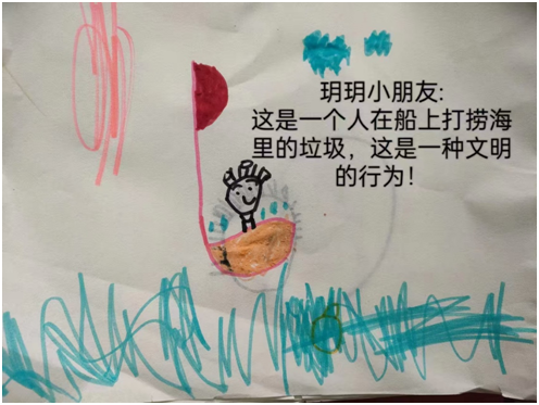 在玥玥小朋友的画中,她手持小网兜,正在模拟海洋的场景中认真“打捞垃圾”。这一场景源自幼儿园开展的“保护地球”实践课。孩子们通过角色扮演,学习了垃圾分类、节约资源等环保知识,将文明行为延伸到对环境的关爱中。玥玥用童真的语言表达了自己的行动:“垃圾不回家,大海会生病。我要做大海的好朋友!”孩子们在活动中不仅增强了环保意识,更懂得了文明行为对保护地球的重要性。
