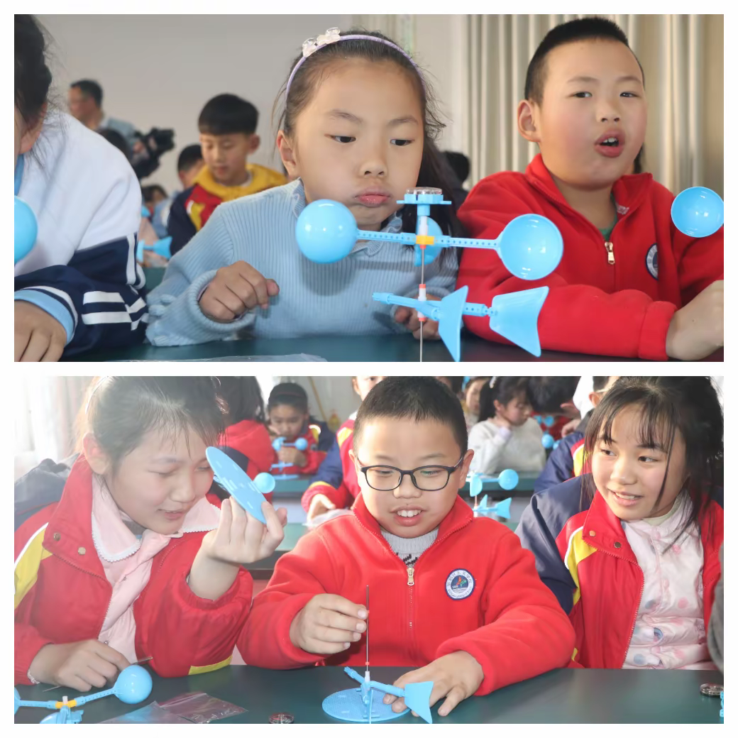 另一边,气象种植社团的约60名成员在下午第一节课下课后来到科学实验室2,参加线下实践活动。他们不仅观看了线上直播内容,还在陈雷老师及其他科学老师的指导下,动手制作风向标。剪刀、图钉在老师的监督下,变成了孩子们探索气象奥秘的工具。孩子们小心翼翼地剪裁、组装,一个个精巧的风向标在他们手中诞生。看着自己的作品,孩子们脸上洋溢着自豪的笑容。