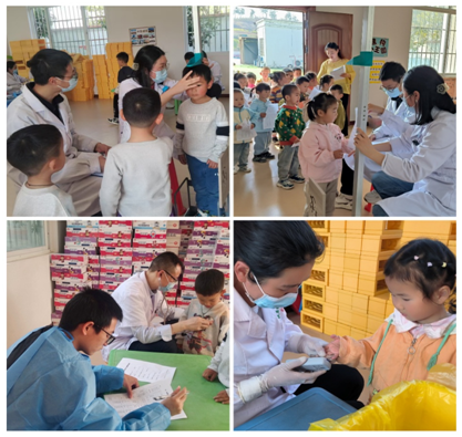 到了心肺功能检查处,听诊器下,萌娃们稚嫩的心跳声清晰可闻。指尖采血测血红蛋白时,不少孩子露出害怕神色,医护人员和老师迅速开启鼓励模式,有的轻抚孩子脑袋,有的讲着有趣故事,在大家的安抚下,孩子们勇敢地伸出小手,完成采血。