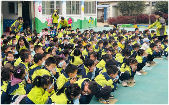 演练前,各班教师通过绘本讲解、情景模拟等方式,向幼儿普及火灾逃生知识。上午10时,警报声骤然响起,全园师生迅速进入应急状态。孩子们在老师引导下,用湿毛巾捂住口鼻,弯腰沿安全通道有序撤离至操场,全程仅用时2分15秒。集合后,各班立即清点人数并上报,确保无一人遗漏。教师代表张红红演练现场讲解灭火器使用方法,指导教职工实操演练,并带领幼儿近距离参观消防器材,通过互动问答加深理解。