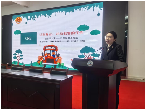 报告会上,检察官王音子结合学生的年龄特点,以“冲动的代价”为主题,通过详实的案例、幽默的语言,深入剖析了校园常见的违法犯罪行为。她联系实例,用通俗易懂、简单实用的方式,以案释法,以法论事为同学们解读案例,一个个案例深深触动了在场的学生,让他们真切地认识到违法犯罪的危害。