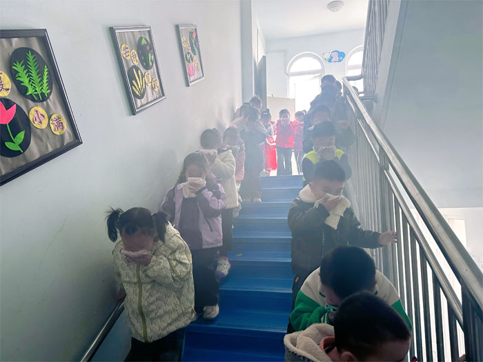 全体师幼按照幼儿园演练方案各就各位,严阵以待,各班教师迅速、冷静地指挥幼儿捂住口鼻手拿湿毛巾,弯腰有序撤离本班教室。各班师幼撤离到安全地带后,开始清点幼儿人数,并及时向指挥组长汇报,整个疏散演练过程既紧凑又有序,没有丝毫的慌乱,达到了预期的效果。