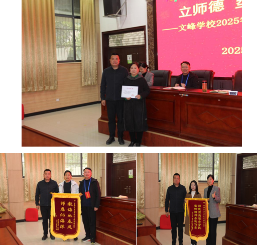 党支部书记、校长刘浩、副校长王力、副校长沈俊俊为初中部凌书勇、小学部包莉筠老师颁发了学生家长赠送的锦旗,为曾都区2024年“新华杯”中小学生文艺节目汇演合唱优秀指导教师王玲颁发了荣誉证书。