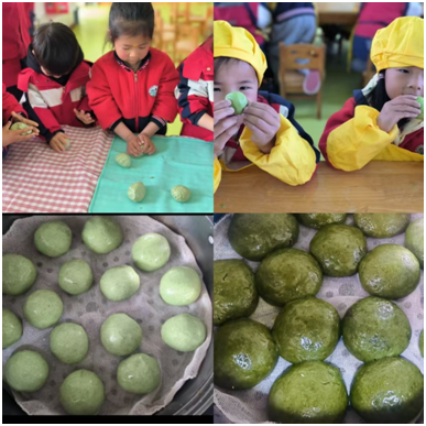 制作青团时,场面更是热闹非凡。老师示范着将糯米粉、艾草汁混合,揉成翠绿面团,孩子们有样学样,小手虽然不太灵活,但热情高涨。包馅料、搓青团,一个个青团在他们手中诞生,尽管形状不太规则,却饱含童真童趣。