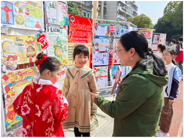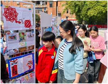 作品展览现场,师生们纷纷驻足欣赏,现场气氛热烈。同学们相互交流感受,对他人的创意和才华赞不绝口。老师们也在一旁耐心讲解,帮助学生更好地理解作品中的文化内涵。