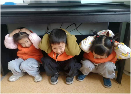“蹲下、护头、抓牢!”孩子们在老师指挥下迅速蜷身钻入桌子下方,小手牢牢抓住桌腿,动作标准如训练有素的小战士。通过前期《地震来了我不怕》的主题课堂,幼儿们已熟记“伏地、遮挡、抓牢”六字口诀。