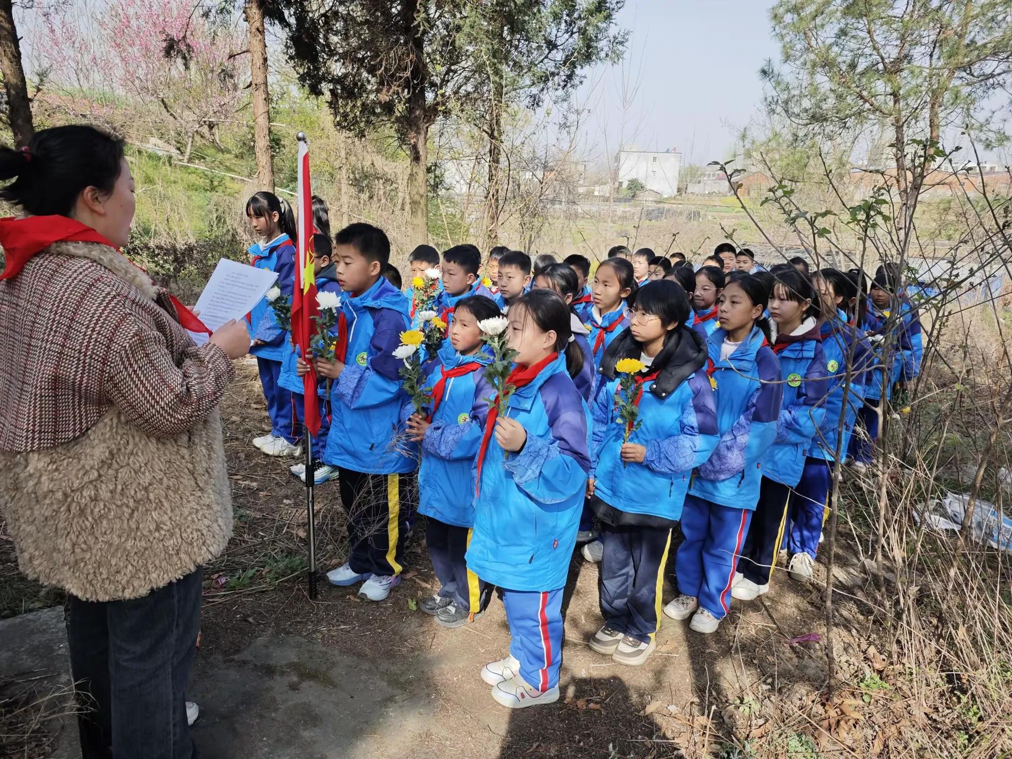 出发前,学校相关负责同志宣读祭扫活动流程,叮嘱学生路途注意安全。少先队员们来到革命烈士陵园,陵园内气氛庄严肃穆。师生纷纷拿起镰刀为陵园清除杂草和枯枝。