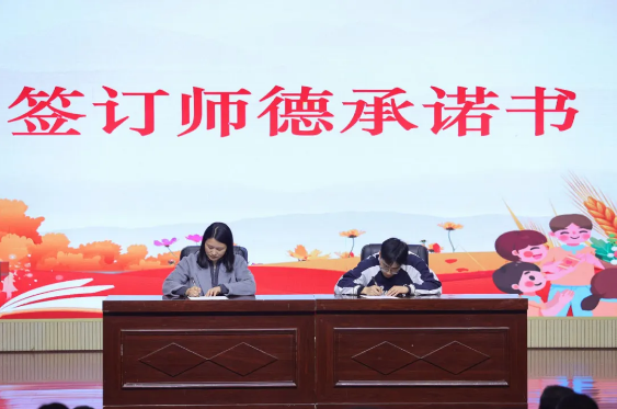 在高昂的宣誓声中活动被推向高潮。全体教师肃立,庄严宣誓,铿锵誓言,响彻礼堂,彰显了教师们坚守师德、奉献教育的坚定决心。随后,全体教师在《师德师风建设承诺书》上郑重签名,以笔为誓,以诺为约。