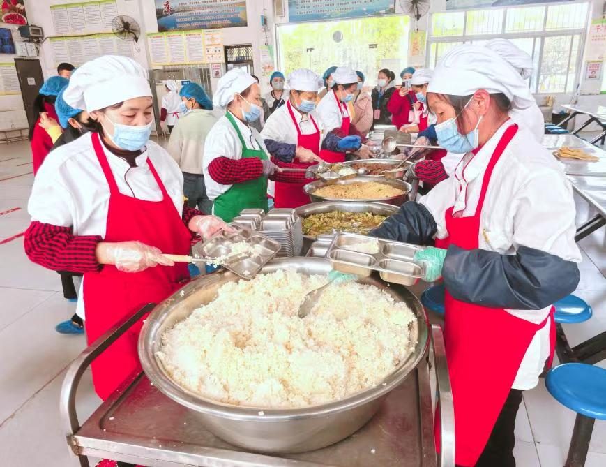副食库,米面粮油分类存放,离地隔墙,温湿度实时监控;入库间,食材进出库严格登记,食材供应商资质及每日检测结果可溯源备查;食品制作间,生熟分区操作,用具区域管理;备餐区,餐品恒温保存,工作人员规范佩戴口罩、手套;分餐观摩,现场观看低年级分餐流程,餐量按年级科学调配,确保学生营养均衡。