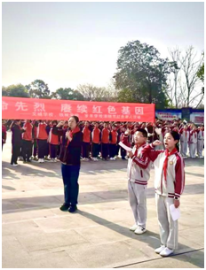 在岁丰学校少先队大队辅导员罗雪老师的带领下,全体少先队员高举右拳,重温入队誓词。