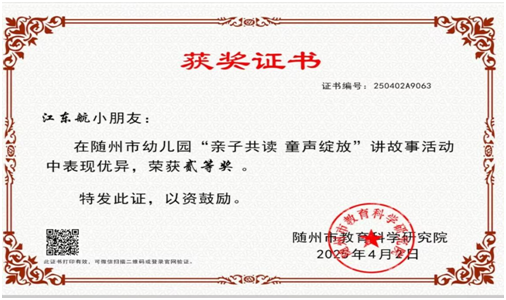 ——曾都区五眼桥小学幼儿园江东航小朋友荣获随州市“亲子共读 童声绽放”讲故事比赛二等奖