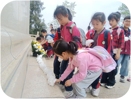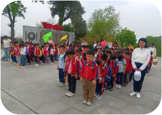 清晨8点40分,孩子们身着统一园服、头戴小黄帽,在老师和家长志愿者的护送下整队出发。队伍徒步一小时到达烈士陵园,在庄严肃穆的烈士纪念碑前,全体肃立。主持人曹梦娇老师轻声致悼:“感谢英雄们的守护,让我们的童年洒满阳光!”随后,园长朱凌飞献上花篮,孩子们手捧亲手制作白花,踮着脚尖依次上前,郑重地将花朵摆放在碑前,用无声的动作诉说着对先烈的感恩。默哀时刻,陵园寂静,孩子们挺直腰背、低头静立,稚嫩的脸庞写满敬畏。