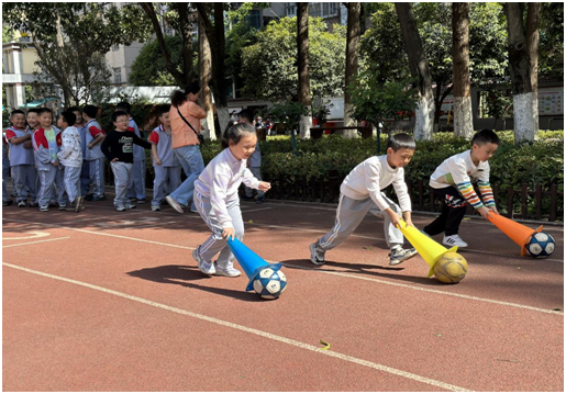 体育课上,老师正带领孩子们进行有趣的团体项目训练。以“哪吒”为主题设计的系列创意团体游戏深得孩子们喜欢:拯救魔丸、超级火尖枪、无敌乾坤圈,孩子们组成竞赛小队在与同伴的相互协作中进行速度、耐力训练,锻炼跑、跳能力和感统协调能力。