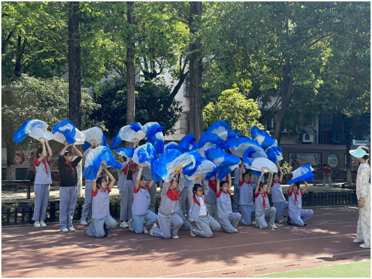 大操场上,一派热闹欢腾的运动场景即刻扑入眼帘。200余人的大型团体操“缤纷”正在排练中,孩子们手持各色彩绸,在音乐老师的共同指导下进行有序练习。孩子们随着音乐节奏时而列成整齐的阵列展示色彩鲜艳的阵仗;时而转动起来,交替变换队形,彩绸在穿插变幻中形成一朵朵奇妙的花朵盛开在大操场上。