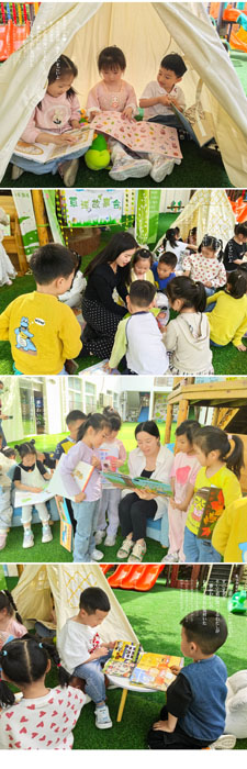 随后的“自由阅读时光”将活动推向高潮。孩子们像一群欢快的小鸟,挑选自己最爱的绘本。有的独自倚靠大树,惬意地翻阅;有的三五成群趴成一排,指着故事里的画面细声交谈;有的和好朋友钻进小帐篷里静静阅读;有的则化身“故事小主播”,大声朗读书中的文字,吸引了小伙伴围坐倾听。老师们也和孩子们偎依在一起,边讲述故事边回应孩子们的提问:“对呀,毛毛虫真的会变成蝴蝶呢!”