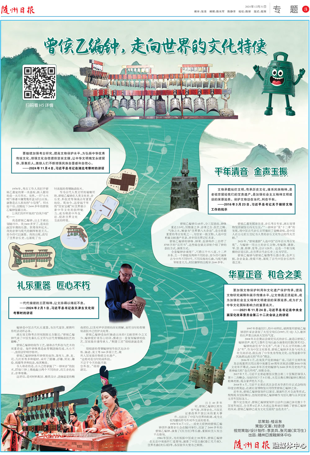 作为古代人类文明的璀璨明珠,曾侯乙编钟在人类文化史、音乐史、科技史等领域占有重要地位。现如今,这穿越千年的“国家宝藏”向世界展示着中华文化的独特魅力,成为增进中外友谊、促进世界文化交流的特使。