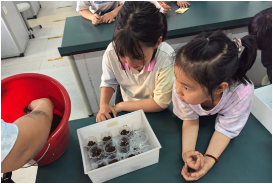 在育苗过程中,种植社团的孩子们化身为“小小观察员”。他们每天都会来到育苗区,仔细观察种子的变化,记录下种子破土发芽的时间、幼苗的高度和叶片的生长情况。遇到问题时,孩子们会主动查阅资料、请教老师,积极寻找解决办法。通过不断地探索和实践,他们不仅掌握了科学的种植方法,更培养了严谨的科学态度和坚韧不拔的毅力。