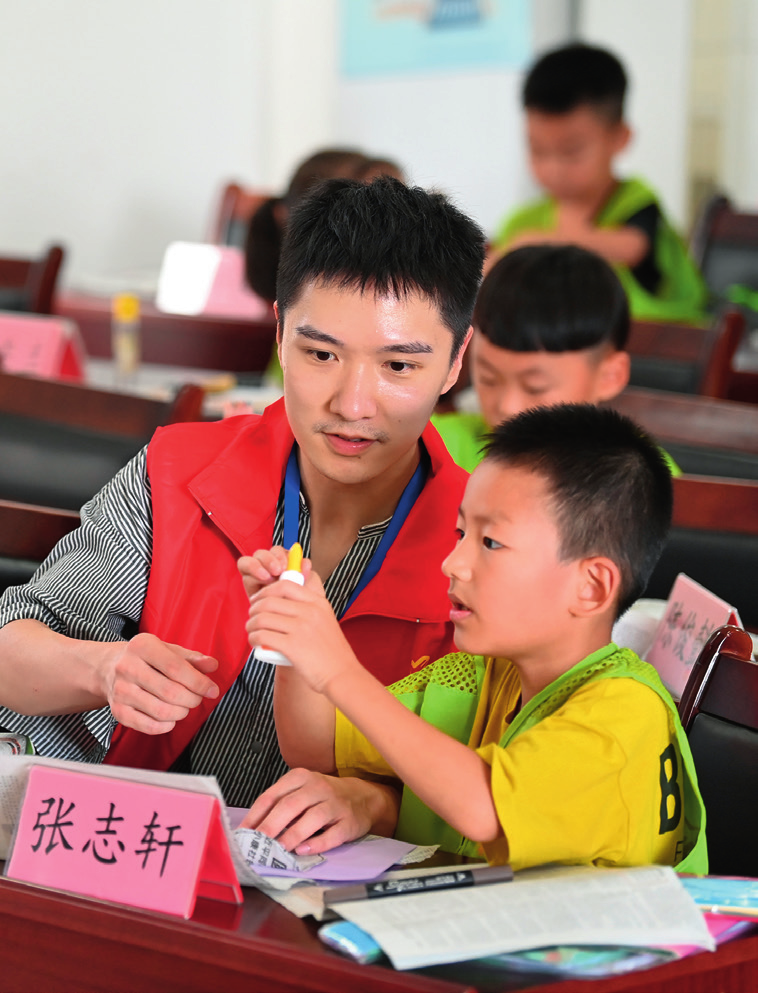 武汉市东湖高新区佛祖岭 B 社区青少年 寒暑假社区托管点内,小学生在志愿者指导 下进行创意美术创作( 2023年7月26日摄) 长江日报供图
