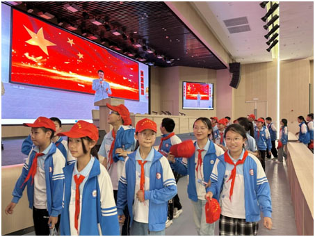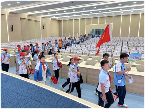 文艺汇演结束后,六年级师生在志愿者带领下开启校园参观之旅。从宽敞的大操场到书香四溢的教学楼,从设施完备的综合楼球馆到各具特色的社团活动室,每一处角落都让学生们充满好奇。在阅读角,他们翻阅丰富的藏书;在校园心愿墙,他们驻足欣赏学生的理想;在优秀学子表彰榜,聆听小解说员的讲解……校园里的每一处细节,都展现着文帝学校独特的魅力。