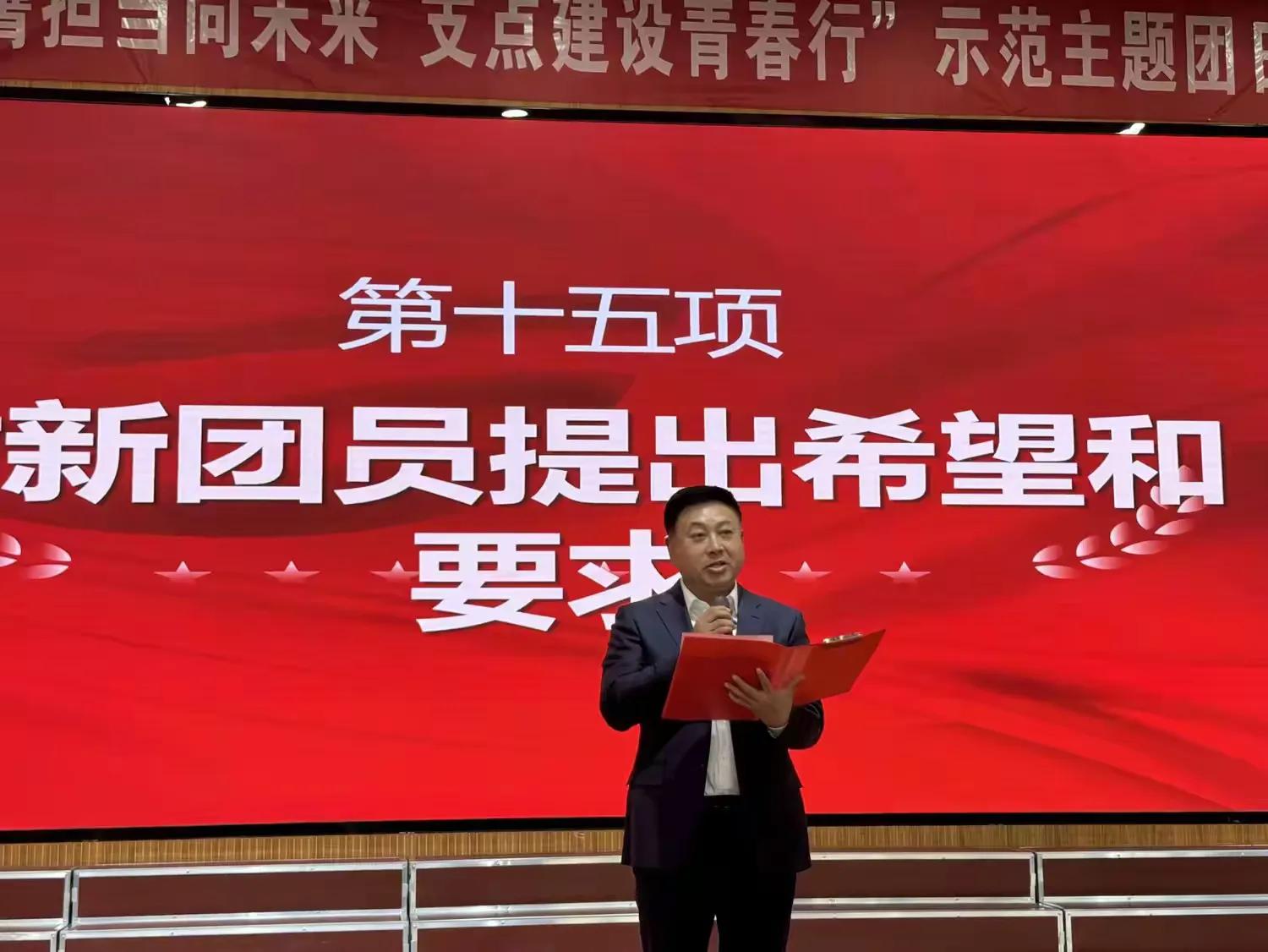 编钟初级中学团委宣读新发展团员名单,93名优秀少先队员光荣地成为共青团员,为团组织注入了新鲜血液,现场响起热烈的掌声,向新团员们表示祝贺。区委组织部、区教育局、团区委、编钟初级中学领导上台共同为新团员颁发团徽和团员证。编钟初级中学校长王元勇对新团员提出希望和要求,希望新团员们坚定理想信念,牢记入团初心,时刻以团员的标准严格要求自己,争做有理想、敢担当、能吃苦、肯奋斗的新时代好青年,为新团员们的成长之路指明了方向。