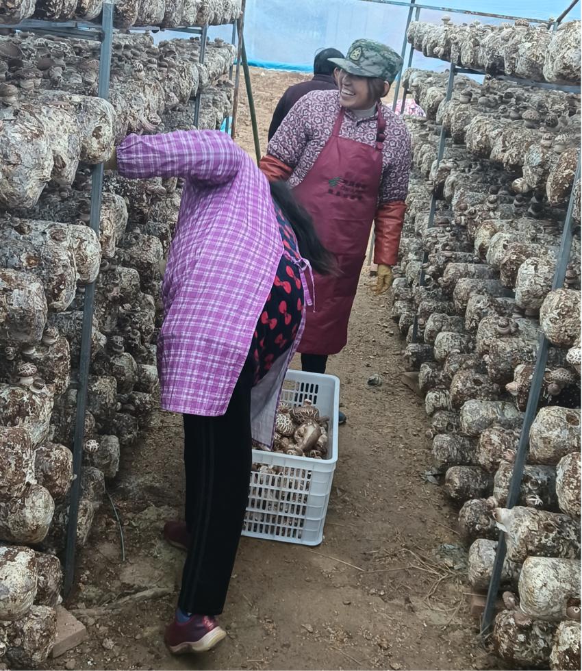 香菇大棚内,一袋袋菌棒整齐排列,一朵朵香菇簇拥而出。村民穿梭在大棚里面,忙着将菌棒上已成熟的香菇摘下来放入筐中。