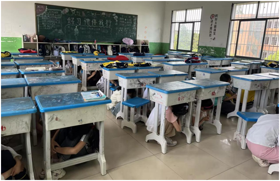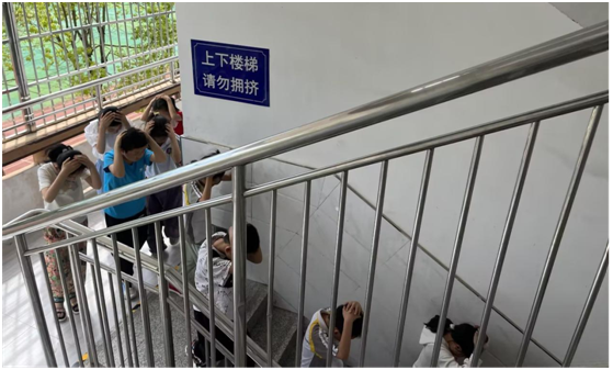 模拟主震过后,各教室里的学生在教师的引导下,排成整齐的队形就近从前后门出口有序撤离教室。从教室到空旷的操场集中过程中,同学们护头弯腰有序快速行进,全体师生争分夺秒,总共用时1分23秒。