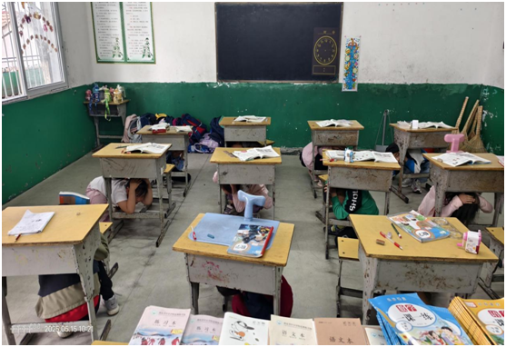 伴随着第一声避险警报响起,防震演练正式开始,老师和学生们立刻停止教学活动。同学们迅速用双手抱头、降低重心,就近到桌子下进行紧急避险。随着第二声警报响起,各班学生在老师的带领下,按预定路线弯腰疾行,沿楼梯两侧迅速向操场撤离。负责楼道、转角安全的教师全程守护,防止推挤。仅用45秒,全部学生安全抵达集结区,各班立即清点人数并上报。整个演练过程组织有序,紧张而不慌乱。
