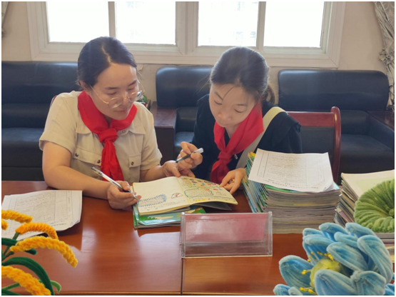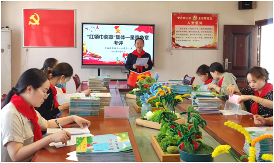 在查看材料的过程中,不同年级的辅导员老师围坐在一起,交流着各自的经验和做法。他们互相学习,互相启发,共同探索红领巾奖章争章实践活动的优秀方法。