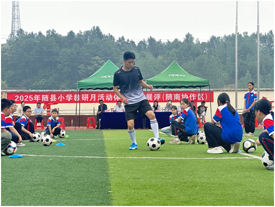 来自随南协作区的8名小学语文教师,围绕经典课题呈现了精彩的课堂设计,他们凭借深厚的教学功底与创新思维,或带学生穿越历史硝烟,感悟英雄的铁血意志;或引领孩童踏入童话秘境,品味语言的奇妙。5名体育老师就《足球—脚内侧运球与变向运用》进行了精彩的课堂展示,教师们以足球教学为切入点,将技能训练巧妙融入趣味游戏与实战模拟中。通过梯度训练、个性化指导等多样方式,激发学生的运动热情。随县教研室领导亲临课堂进行指导,为教研活动注入强劲动力。