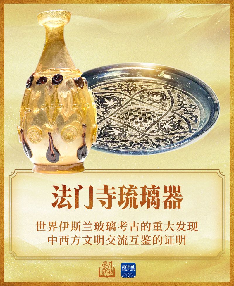 2014年3月,习近平主席在巴黎联合国教科文组织总部发表演讲时,特别提到了1987年在陕西法门寺地宫中出土的20件精美的琉璃器,这是唐代传入中国的东罗马和伊斯兰的琉璃器。他说:“我在欣赏这些域外文物时,一直在思考一个问题,就是对待不同文明,不能只满足于欣赏它们产生的精美物件,更应该去领略其中包含的人文精神”。