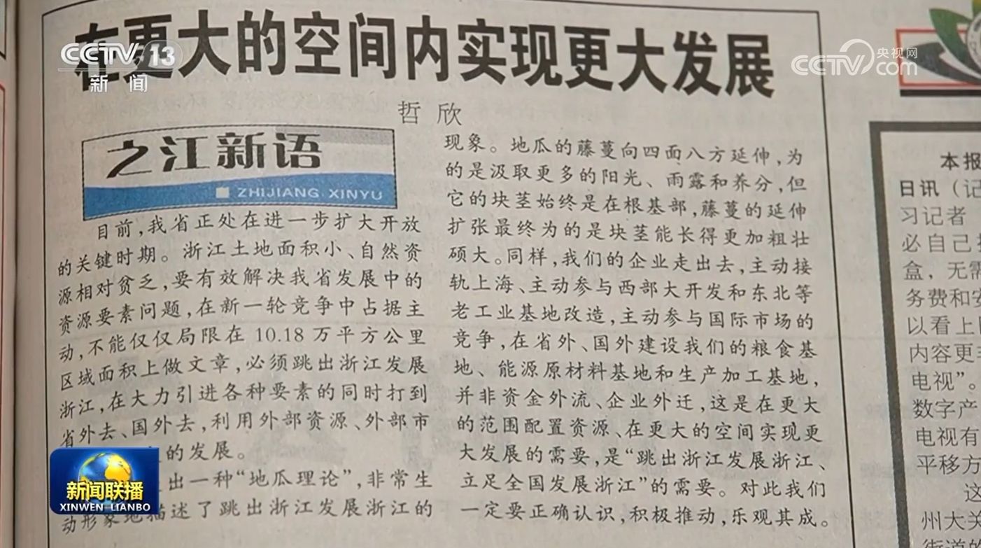 基于深入的调研,习近平同志从战略全局视野出发,提出要跳出浙江发展浙江。当年8月,他在《浙江日报》“之江新语”专栏发表短评,阐述如何在新一轮竞争中占据主动。文中写道:地瓜的藤蔓向四面八方延伸,为的是汲取更多的阳光、雨露和养分,但它的块茎始终是在根基部,藤蔓的延伸扩张最终为的是块茎能长得更加粗壮硕大。同样,我们的企业走出去,并非资金外流、企业外迁,这是在更大的范围配置资源、在更大的空间实现更大发展的需要。