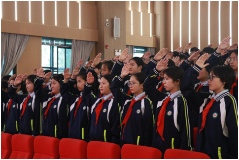 全体齐唱《光荣啊,中国共青团》,歌声铿锵有力。在嘹亮的团歌中,在团旗的指引下,同学们完成了从红领巾到团徽的跨越,变的是身份,不变的是炽热的初心。此次活动,助力优化营商环境,增强了同学们的团员意识,激励着五丰学子们做追光的赤子,迈向青年时代,以青春之名接力奋斗,在新征程中挺膺担当,书写属于自己的青春华章。