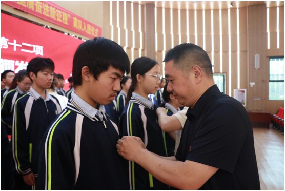 校团委赵明锋老师领学《团章》中有关团员的义务和权利的条款,让新团员们明确自身肩负的责任与使命。新团员代表秦鹤林表示这枚团徽不仅是荣誉,更是责任,今后将以团员标准严格要求自己,努力学习,积极进取。老团员代表宋瑾瑜同学分享了自己入团后的成长感悟,号召新团员们用实际行动为团旗增光添彩。