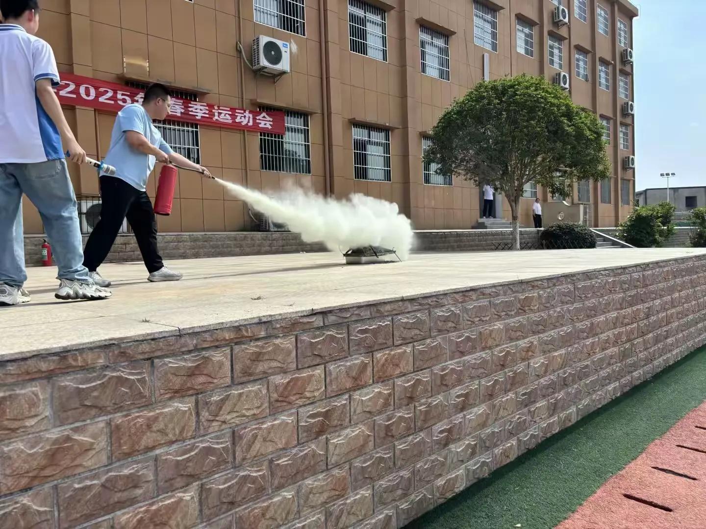 唐威老师给学生演示灭火器使用方法,并现场指导两名学生操作。