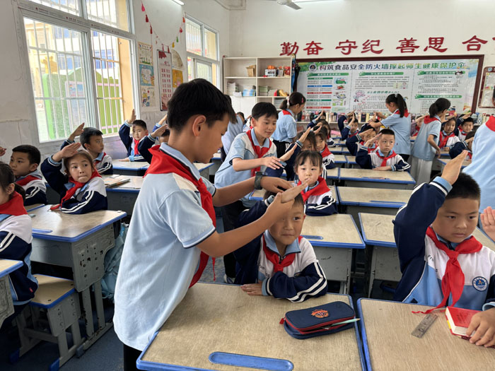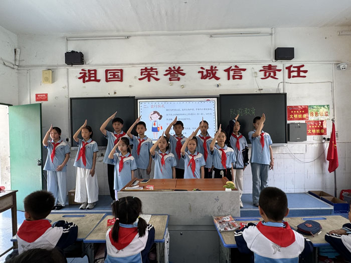 在学习完少先队基本知识后,喻老师与大队干部着手教孩子们什么是“六会”。“领巾披肩尖,左压右,右绕圈……”大队干部手把手教萌娃们系红领巾,稚嫩的手指反复练习,直到鲜红的三角巾在胸前绽开骄傲的“花”。挺直腰板学敬队礼,五指并拢高举过头——“人民的利益高于一切”!呼号、宣誓、唱队歌,童声虽嫩,却字字铿锵,仪式感中埋下责任的种子。