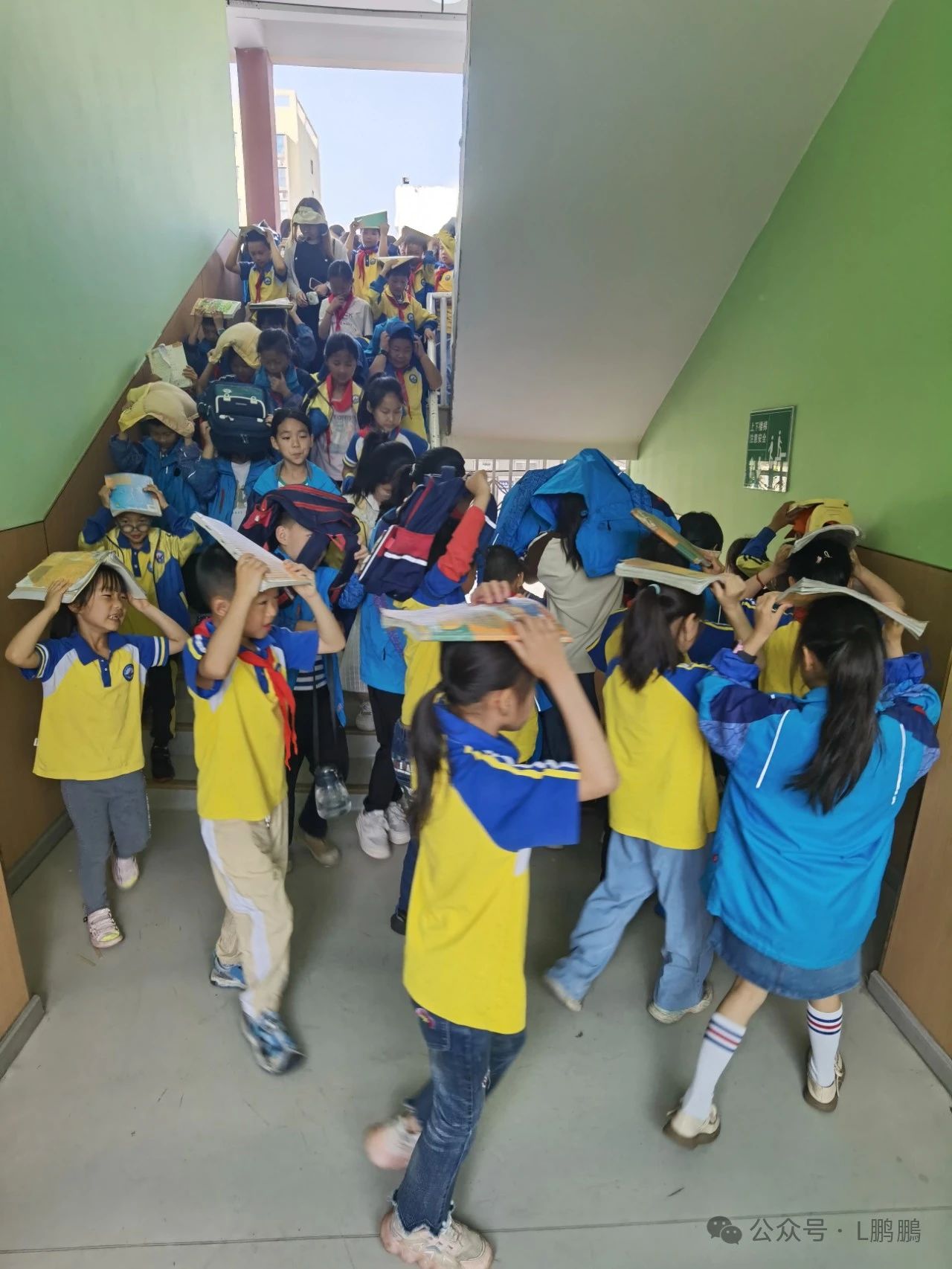 上午9点05分时许,校园里突然响起尖锐的警报声。正在上课的学生们闻令而动,迅速蜷身蹲在课桌下方,动作娴熟规范。待 “地震波” 减弱,在任课教师的引导和楼道安全员的疏导下,学生们弯腰低姿、护住头颈部,沿着既定路线,井然有序地向操场撤离。在 3分 40秒内,全校师生便安全集结。各班班主任立即清点人数,并由班长向刘老师汇报班级人数,整个演练过程紧张有序、有条不紊,充分展现了师生们过硬的应急素养。