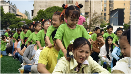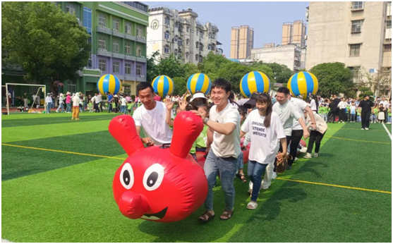 亲子共闯关卡, 默契升温爱意。运动会巧妙融合哪吒“我命由我不由天”的励志精神,设置了“混天绫接力”“火焰球出击”等合作项目。爸爸们弯腰充当“障碍桥”,孩子灵活攀爬;妈妈们与宝贝共推“火焰球”完成挑战。现场温馨瞬间频现,家长与孩子在协作中自然流露的拥抱与击掌,成为最动人的风景。