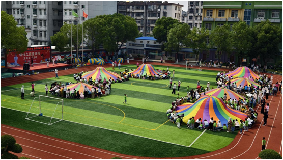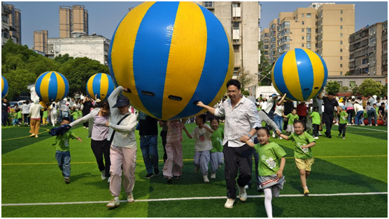 神话赋能运动, 文化浸润童年。运动会以哪吒“勇敢坚毅”的精神为核心,设计了多项创意游戏。开场环节中,孩子们化身“小哪吒”,与家长携手挑战“龙舟破浪——灵珠护佑”竞赛。10组家庭为一队,通过接力划船、穿越障碍等任务争夺“灵珠”,现场呐喊声与欢笑声交织。哪吒是孩子们熟悉的英雄,将神话角色融入运动,既能激发孩子兴趣,也能让他们在运动中理解传统文化中的勇气与担当。