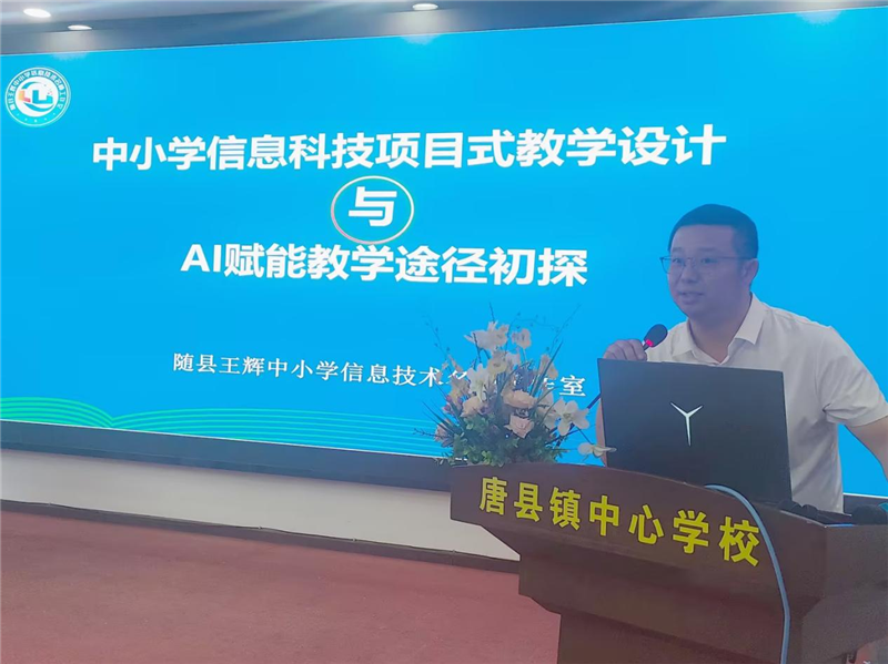 随州日报讯(通讯员:代旭、王辉 摄影:汪雄伟、彭森)5月22日,随县中小学教师继续教育中心在唐县镇中心学校成功举办“项目驱动创新,AI赋能融合”王辉名师工作室送教培训活动。全县各镇(场)信息技术教师、分管校长及名师工作室成员齐聚一堂,共研信息科技项目式教学和AI技术与学科教学的创新实践。