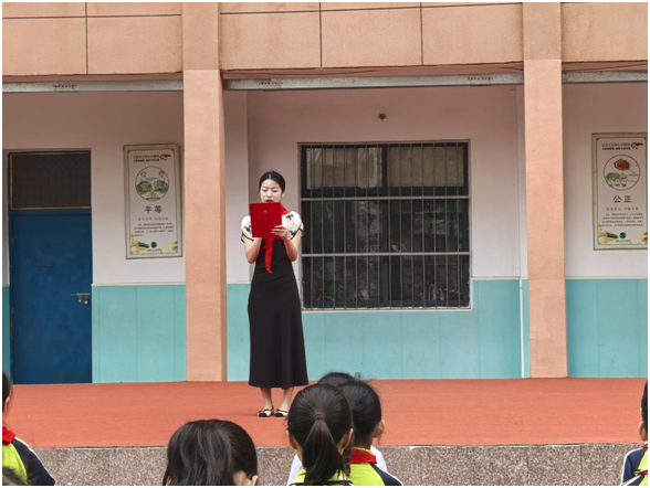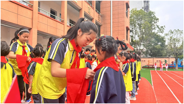 授戴红领巾环节将仪式推向高潮。老队员们神情庄重,双手小心翼翼地为新队员系上红领巾,每一个动作都饱含着关爱与期许。四(2)中队周家君同学作为老队员代表送上寄语,她以自身经历鼓励新队员在成长道路上不惧困难、勇往直前。新队员代表发言时,稚嫩的声音中满是对少先队组织的向往和为红领巾增光添彩的决心。