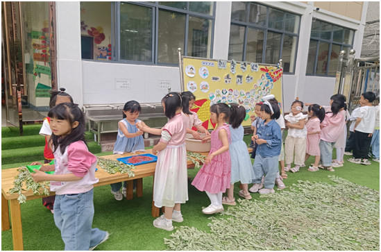 端午节有着丰富的文化内涵,像赛龙舟、吃粽子、挂艾叶、系五彩绳、喝雄黄酒等习俗都有其历史渊源,寓意驱邪避灾,祈求平安和团圆。宝贝们踩艾叶、手沐兰汤、系五彩绳,感受节日的氛围。