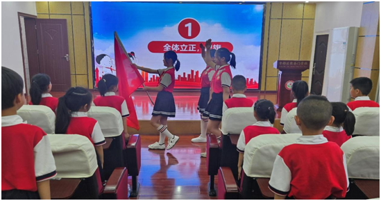 伴随着激昂的《出旗曲》,旗手们高举队旗昂首前行,拉开了入队仪式的序幕。