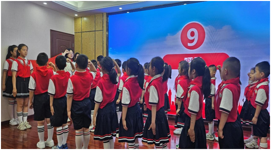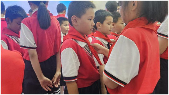 在"红领巾心向党"的歌声中,五年级优秀少先队员为新队员佩戴上鲜艳的红领巾,象征着革命精神的代代传承。
