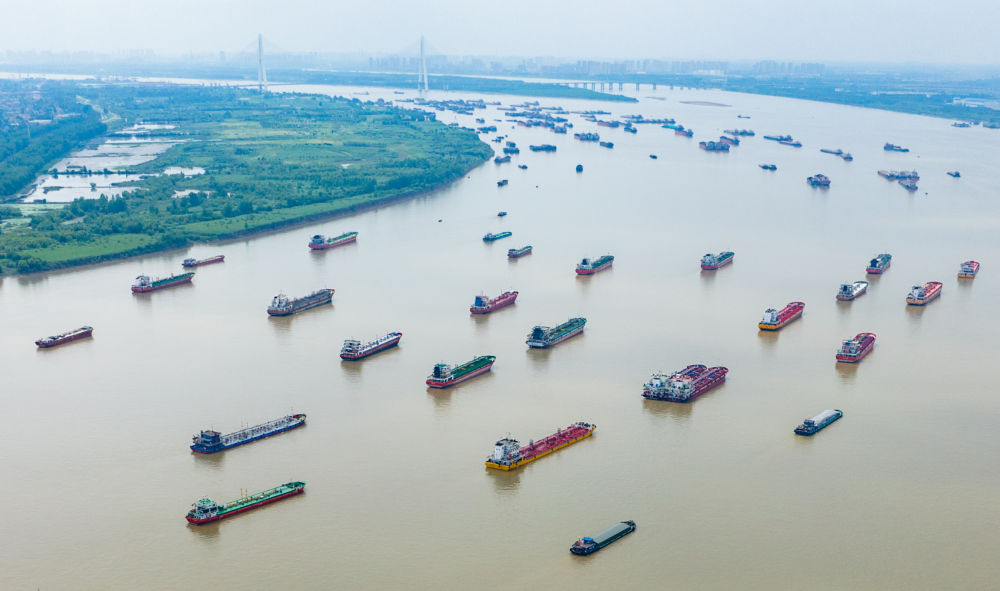 2024年6月1日,船舶在湖北武汉阳逻港区水域行驶(无人机照片)。新华社记者 杜子璇 摄