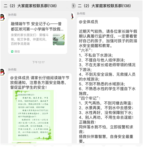 学校深知学生安全需要家校社协同守护。通过班级QQ群、学校微信公众号等网络平台,政教处及时向全体家长推送了《端午假期学生安全温馨提示》,明确假期安全监护责任,呼吁家长切实加强对孩子的安全教育和日常管理,尤其在防溺水、外出交通等方面加强关注与防范,形成家校联动、齐抓共管的强大合力。