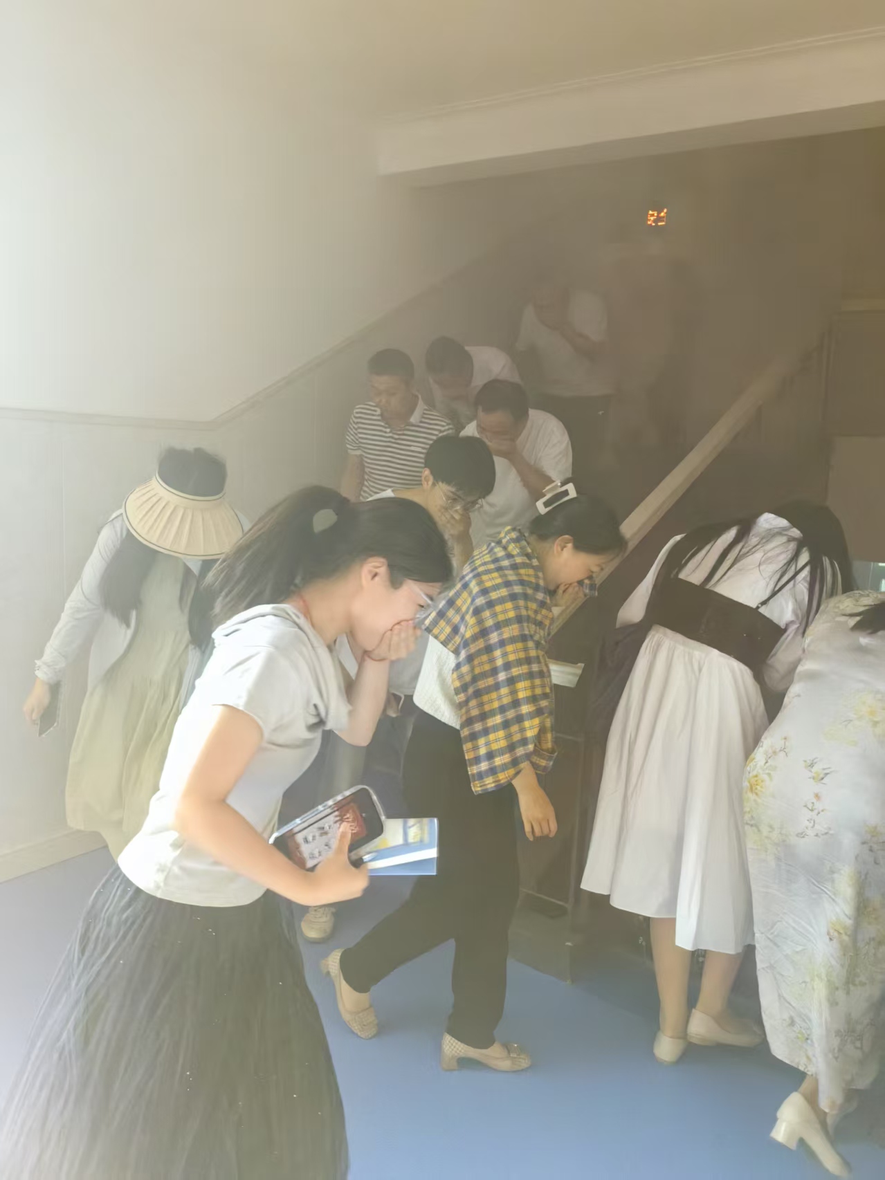 理论学习后,逼真的消防逃生演练随即展开。模拟火灾现场浓烟四起,警报声骤然响起,在易教官的指导下,全体人员迅速按照既定路线,弯腰低姿、掩住口鼻有序撤离。演练中,重点强调了患者优先疏散、避免拥挤踩踏等关键要点,确保在突发火情时能高效保障生命安全。