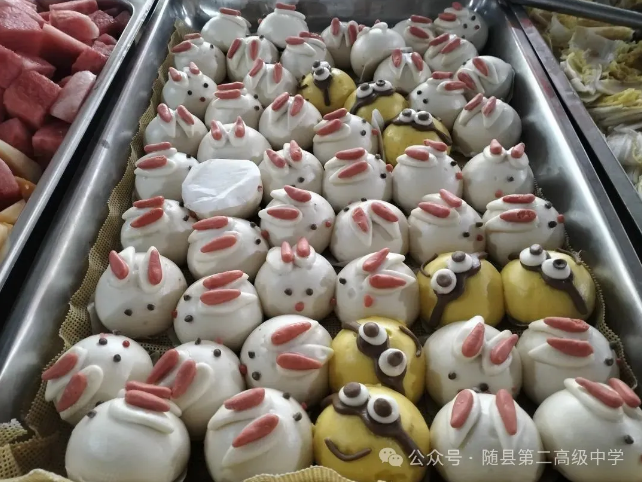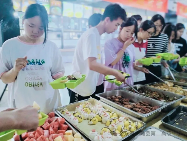 最妙的是卡通动物的面点,这是食堂师傅们用面团捏出的祝福:祝大家高考时“面面”俱到,“点”石成金!同学们围坐在餐桌前,吃着美味可口的饭菜,有说有笑,大快朵颐。