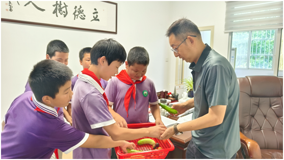 勤耕垄亩育新蔬,诚奉甘饴谢师恩。数月来,在老师的悉心指导下,学生们躬身实践,从翻土播种、育苗移栽,到沤肥滋养、搭架护苗,每一个环节都倾注着汗水与期待。6月5日,“口袋菜园”终于迎来首次采摘,嫩绿的黄瓜垂挂藤蔓,紫红的番茄缀满枝头,金黄的秋葵花开正盛,满园皆是生机。尽管首批果实数量有限,孩子们却满怀感恩,第一时间将新鲜采摘的蔬果献给校长与老师。当稚嫩的双手郑重递上劳动成果,师生共品清甜,笑语盈盈间,校长和老师们对学生的实践成果给予高度肯定,这场充满温情的丰收之约,让劳动教育的意义在分享中悄然升华。