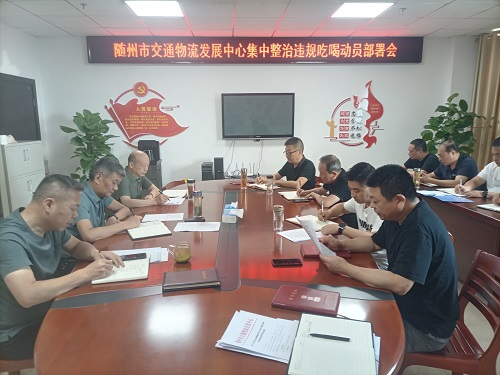 6月5日,随州市交通物流发展中心召开集中整治违规吃喝动员部署会,传达贯彻中央层面深入贯彻中央八项规定精神学习教育工作专班、中央纪委办公厅关于2起党员干部在学习教育期间违规吃喝、严重违反中央八项规定精神典型问题的通报,以及全省、全市及市交通运输系统集中整治违规吃喝动员部署会精神,宣读了《全省集中整治违规吃喝工作方案》,并结合中心实际研究部署贯彻落实意见。中心总支书记、主任黄华文参加会议,并对中心集中整治违规吃喝工作进行安排,中心全体干部职工参加了会议。